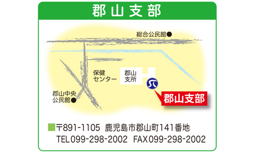 鹿児島市の北西部、国道328号線近くにある郡山支所内に郡山支部はあります。郡山支部では4つの地域班に分かれて地域の活動(地域班会、ボランティア活動、レクレーション等)を行っており、ボランティア清掃作業では小学校の清掃等、地域の方にとても喜ばれています。